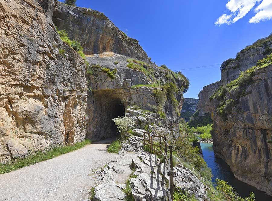Desfiladero de gran belleza con pasarelas y túneles excavados en la roca, ideal para paseos familiares y observación de aves rapaces.